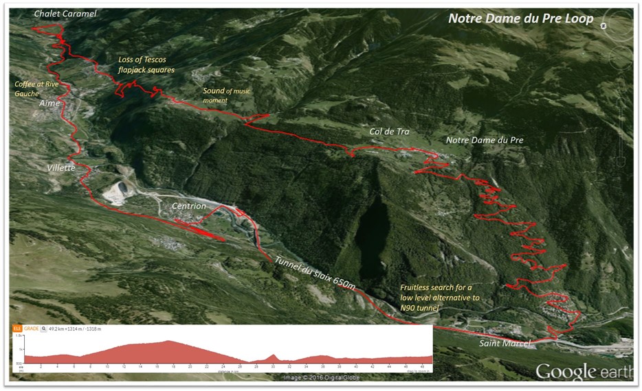 I headed gently upwards for around 8 kms to a beautiful section of road above the tree line from Longefoy to the village of Notre Dame du Pre. With the sound of cow bells and masses of wild flowers in the alpine meadows, I suddenly found myself having a ‘Sound of Music’ moment and realised how lucky I was not to be sitting at a desk somewhere. Both villages were very picturesque and I noted that Notre Dame du Pre had a restaurant/bar for future rides. The climb topped out at 1300 ms at the Col de Tra; not one of the famous Tour de France ascents, so in a slightly subversive way, I liked it all the more!