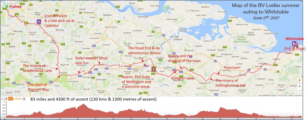 When I saw a Bella Velo FB invitation to ride along the Pilgrims Way to Whitstable, with the promise of fish and chips by the sea, I was both interested and intrigued. Intrigued because the BV ladies don’t normally stray so far from West London, and normally run training rides with an emphasis on the performance side of cycling (speed, endurance …..). This was an A to B ride along an ancient trackway, more renowned for its history than it’s Strava segments! It turned into something of an epic; not a ‘monster, never to be repeated’ kind of epic, but an epic none the less.